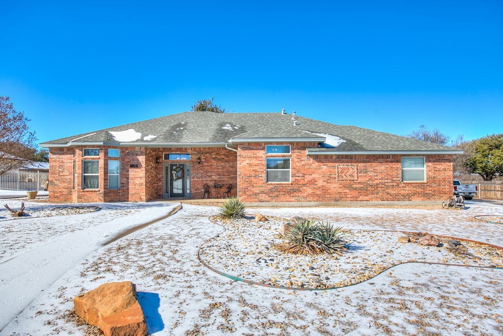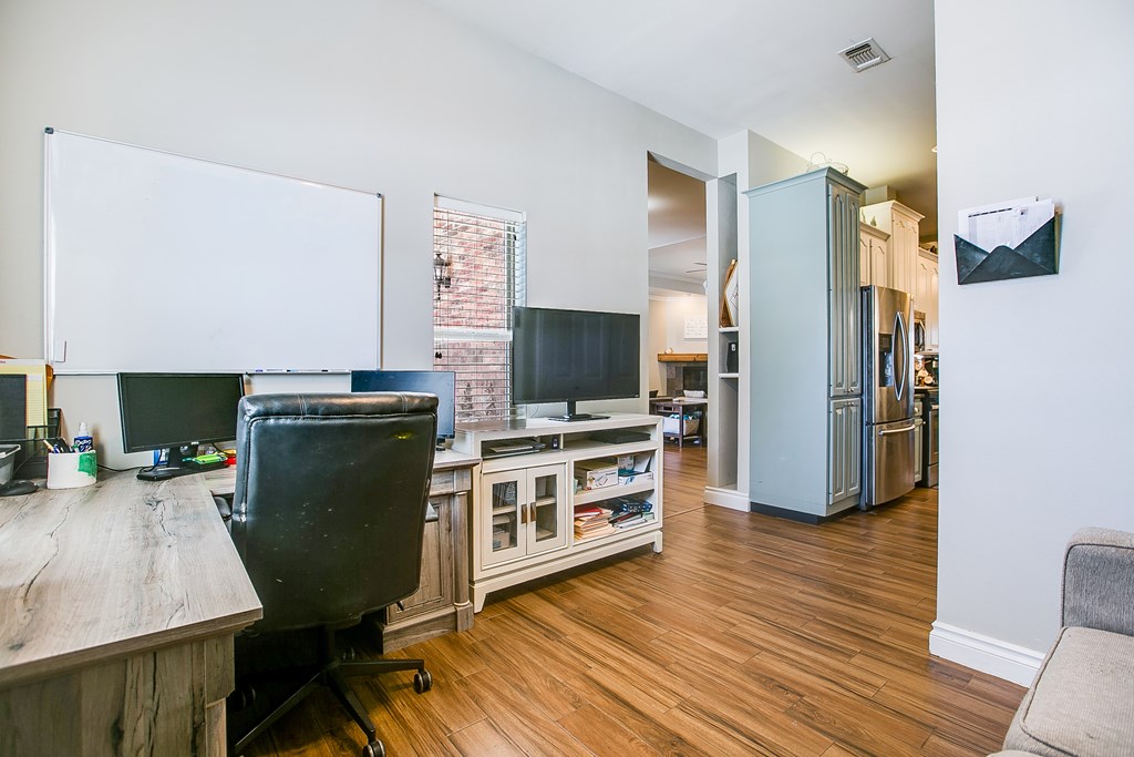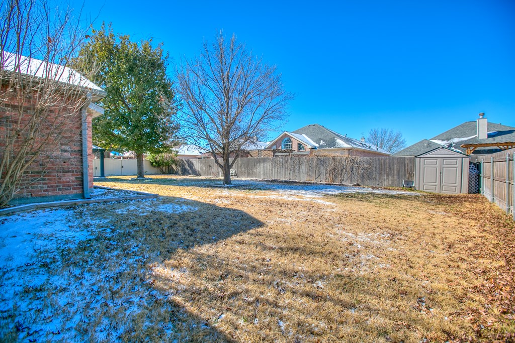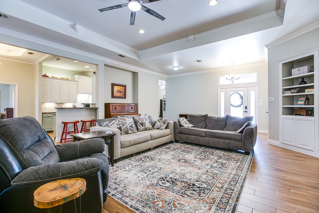 Beautiful 3 bedroom, 2 bathroom home located in The Bluffs, featuring a fantastic split bedroom floor plan with over 2,100 square feet of living space. The oversized living area offers tall ceilings & a cozy gas fireplace, creating a welcoming space for everyday living and entertaining. Easy-care wood-look tile flooring runs throughout the home, with carpeted guest bedrooms for added comfort. The spacious primary suite includes a large en-suite bath with a soaking tub & walk-in shower. The dining room is currently used as a home office or media/game room, offering flexible living options. Situated on an oversized lot with xeriscaped front yard for low maintenance, extra parking, and a 2-car attached garage complete with a workshop area. Additional storage is provided by a storage shed just outside the double gate. Enjoy outdoor living year-round on the screened-in porch?perfect for keeping flies and mosquitoes away.