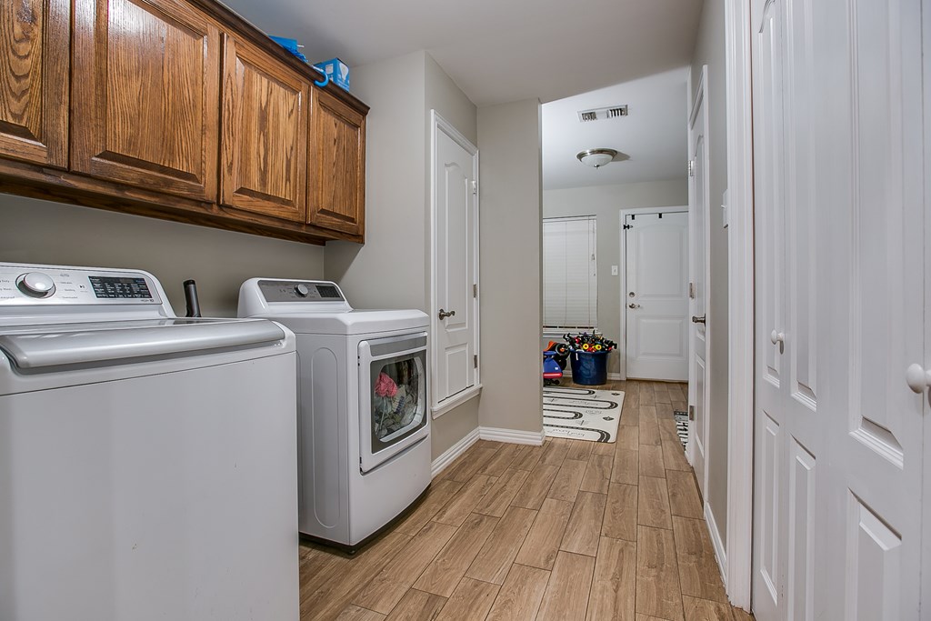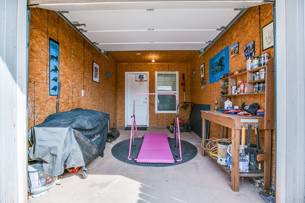 Welcome Home! Beautiful home in the Bluffs. You will not be disappointed with a the open layout offering a chance to have some great family functions! Also, the thoughtful split bedroom layout giving everyone their space. Escape to the primary suite with corner garden tub to soak away the day. Chef inspired kitchen to make those holiday meals. Oversized utility room for laundry area and large pantry. Bonus mud room off the garage but also adjacent to the golf cart garage...Did I mention you can bring your golf cart? Space can also be used as a work out space, BBQ area etc. This home offers not one fenced yard, but two! The possibilities are endless. Features also include ceramic tile in main areas. Playscape, trampoline and refrigerator are all negotiable. Room sizes are approxiamate.